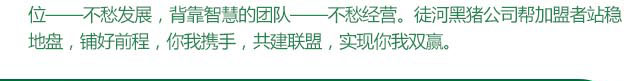 先思、先悟、先行、先入、先得、先贏,先人一步創(chuàng)品牌,先入為主占市場。任何產(chǎn)業(yè)加盟成功的關鍵都是將企業(yè)和加盟商聯(lián)系在一起,“你中有我,我中有你”,實現(xiàn)加盟投資者與企業(yè)雙贏。背靠品牌的創(chuàng)業(yè)--不愁人氣,背靠大樹的店鋪--不怕競爭,備考健康的定位--不愁發(fā)展,背靠智慧的團隊--不愁經(jīng)營。徒河黑豬公司幫加盟者站穩(wěn)地盤,鋪好前程,你我聯(lián)手,共建聯(lián)盟,實現(xiàn)你我雙贏。