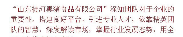 "山東徒河黑豬食品有限公司"深知團隊對企業(yè)的重要性。搭建良好平臺,引進專業(yè)人才,依靠經(jīng)營團隊的智慧,深度解讀市場,掌握行業(yè)發(fā)展態(tài)勢,用全新服務模式切入市場。