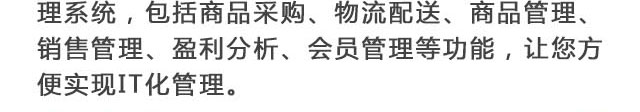 公司與國內知名IT公司合作建立一套完善信息管理系統(tǒng),包括商品采購、物流配送、商品管理、銷售管理、盈利分析、會員管理等功能,讓您方便實現(xiàn)IT化管理。