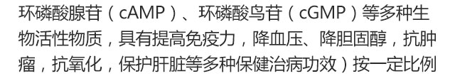 鳥(niǎo)苷(cGMP)等多種生物活性物質(zhì),具有提高免疫力,降血壓、降膽固醇,抗腫瘤,抗氧化,保護(hù)肝臟等多種保健治病功效)按一定比例粉碎混