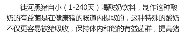 徒河黑豬自?。?-240天)喝酸奶飲料,制作這種酸奶的有益菌是在健康豬的腸道內(nèi)提取的,這種特殊的酸奶,不僅更容易被豬吸收,保