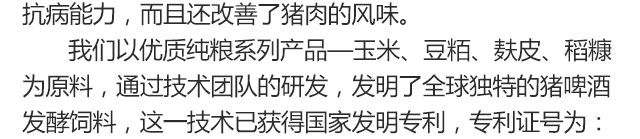 得國(guó)家發(fā)明專利,專利證號(hào)為:(ZL 2011 1 0233018.2),啤酒發(fā)酵飼料的應(yīng)用提高了豬肉的不飽和脂肪酸的含量,改善了肉質(zhì)。