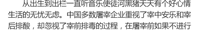 從出生到出欄一直聽(tīng)音樂(lè)使徒河黑豬天天有個(gè)好心情,生活的無(wú)憂無(wú)慮。中國(guó)多數(shù)屠宰企業(yè)重視了宰中安樂(lè)和宰后排酸,卻忽視了宰前排毒的