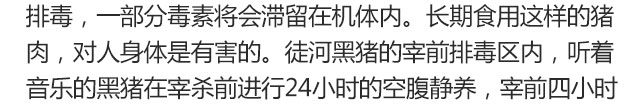 過(guò)程,在屠宰前如果不進(jìn)行排毒,一部分毒素將會(huì)滯留在機(jī)體內(nèi)。長(zhǎng)期食用這樣的豬肉,對(duì)人身體是有害的。徒河黑豬的宰前排毒區(qū)內(nèi),聽(tīng)著音樂(lè)
