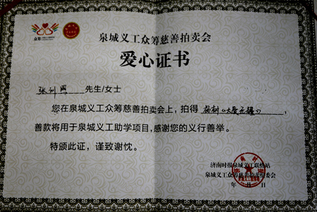 2014年8月24日,在美麗的泉城濟(jì)南錦云川大酒店,由濟(jì)南報(bào)業(yè)集團(tuán)、濟(jì)南時(shí)報(bào)泉城義工聯(lián)絡(luò)站、泉城義工慈善拍賣組委會(huì)主辦的“泉城義工慈善拍賣會(huì)”隆重召開(kāi),與會(huì)企業(yè)單位和人員三百余人,本次拍賣所得善款,將全數(shù)用于泉城義工助學(xué)項(xiàng)目基金。