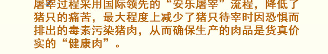 屠宰過程采用國際領(lǐng)先的“安樂屠宰”流程,降低了豬只的痛苦,最大程度